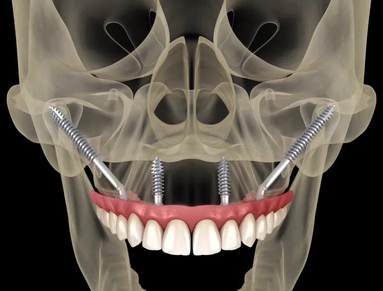Maxillary prosthesis supported by zygomatic implants Medically accurate 3D illustration of human teeth and dentures